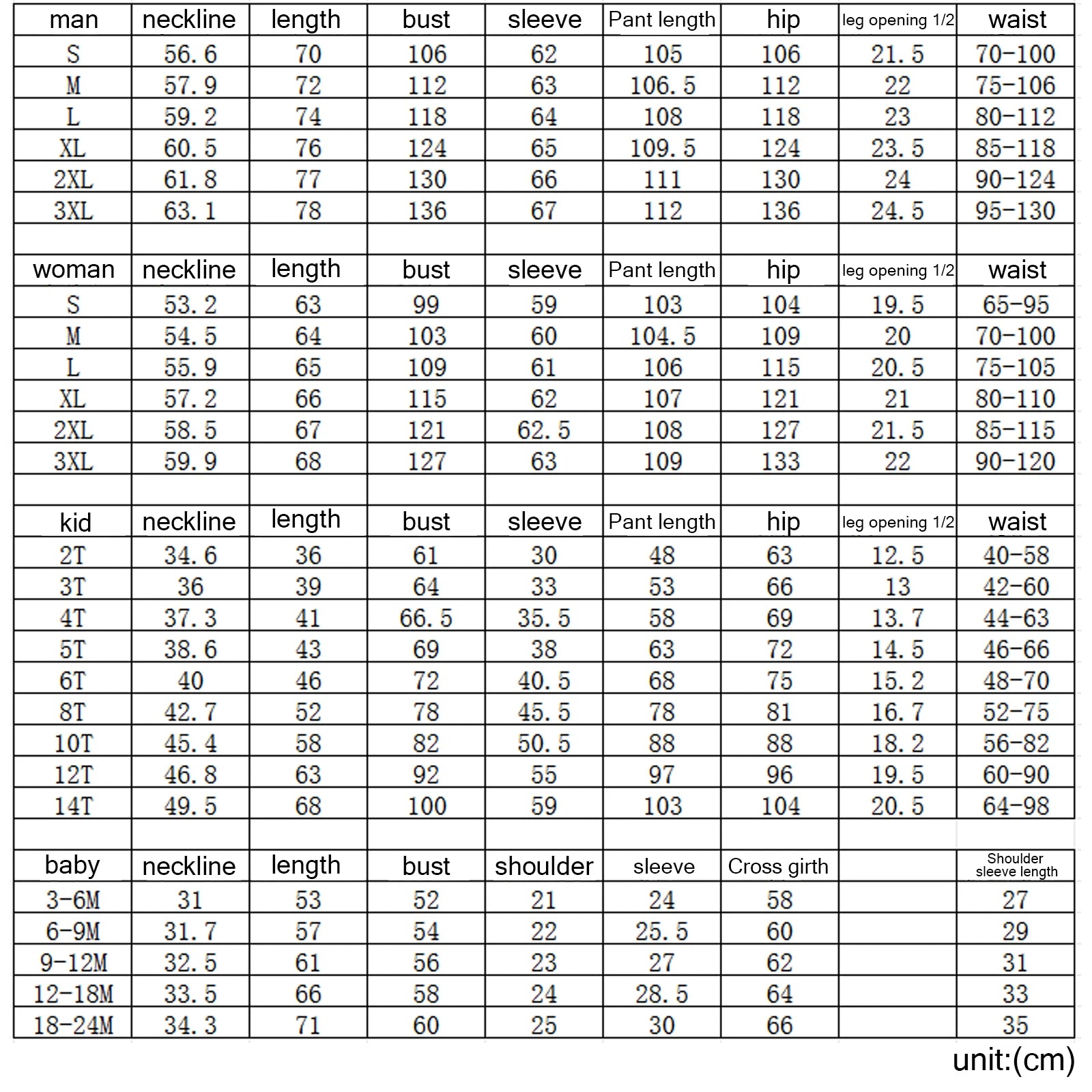 Advised Age: 3 Years Tops Length: 39 / 15.35 Bust: 64 / 25.20 Pant Length: 53 / 20.87 Waist: 42-60 / 16.54-23.62
